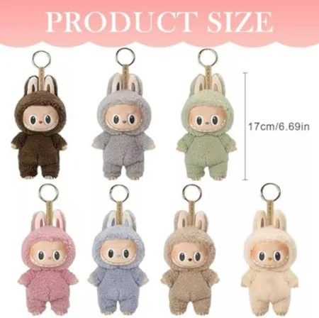 Each Labubu comes dressed in a unique color – from soft pink to mint green, lavender, beige, and more.